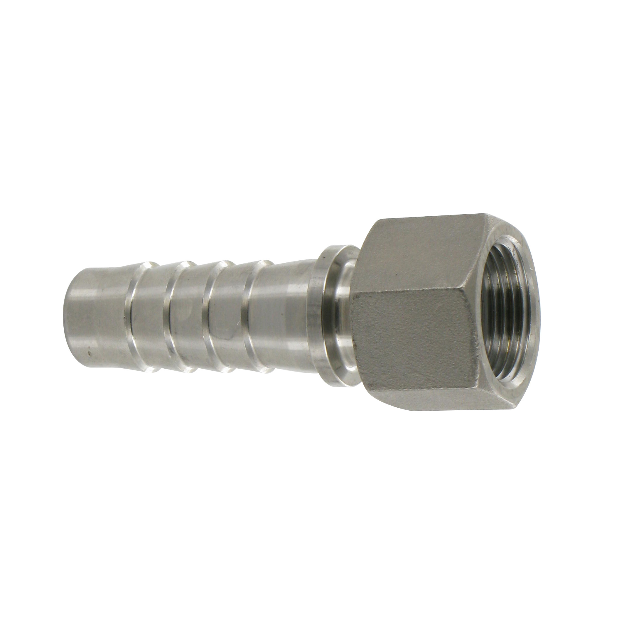 Aufbau: Hochdruck Schalenverschraubung mit Innengewinde, flachdichtend, mit gerillter Schlauchtülle, Überwurfmutter und Sicherungsbund, zur Montage mit Klemmschalen.